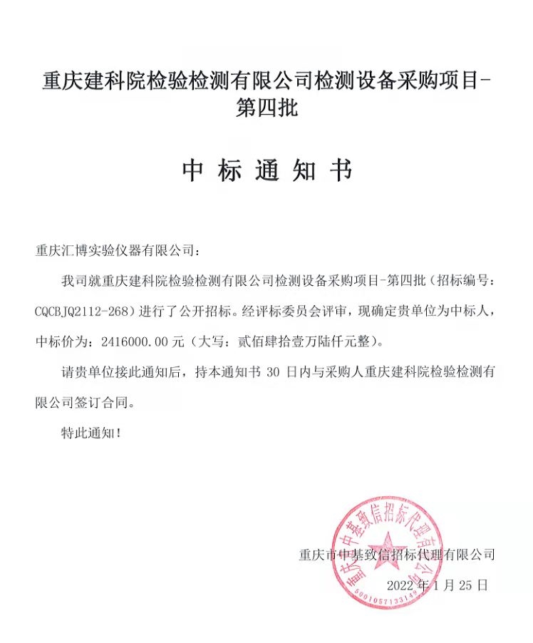 重慶建科院檢驗(yàn)檢測(cè)有限公司委托重慶市中基致信招標(biāo)代理有限公司對(duì)我公司檢測(cè)設(shè)備采購(gòu)項(xiàng)目(項(xiàng)目號(hào):CQCBJQ2112-268 )重慶建科院檢驗(yàn)檢測(cè)有限公司檢測(cè)設(shè)備采購(gòu)項(xiàng)目-第四批進(jìn)行了公開(kāi)招標(biāo)采購(gòu),現(xiàn)已完成全部采購(gòu)程序。確認(rèn)重慶匯博實(shí)驗(yàn)儀器設(shè)備有限公司為檢測(cè)設(shè)備采購(gòu)項(xiàng)目-第四批中標(biāo)人,中標(biāo)價(jià)為2416000元(貳佰肆拾壹萬(wàn)陸仟佰元整)。
