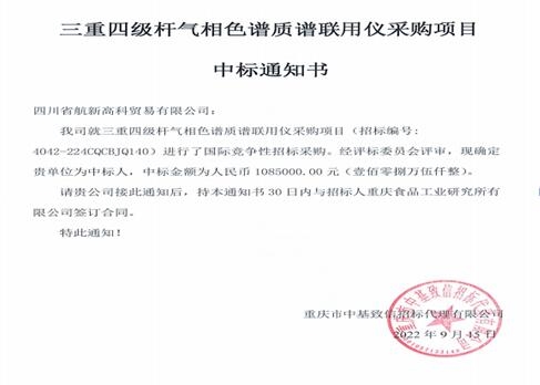 重慶食品工業(yè)研究所有限公司委托重慶市中基致信招標(biāo)代理有限公司對三重四級桿氣相色譜質(zhì)譜聯(lián)用儀采購項(xiàng)目(招標(biāo)編號:4042-224CQCBJQ140)進(jìn)行國際競爭性招標(biāo)采購,現(xiàn)已完成全部采購程序。確定中標(biāo)人四川省航新高科貿(mào)易有限公司,中標(biāo)金額為人民幣1085000.00元(壹佰零捌萬伍仟整)。