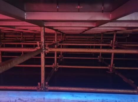 按照會議主席臺布置要求,此次會議在原有舞臺上搭建了臨時臺架,采用承插型盤扣式鋼管,總長約22.8m、總寬約13.0m、最低處約0.2m、最高處約0.9m,呈階梯狀布置,上部使用功能為領導坐席。
