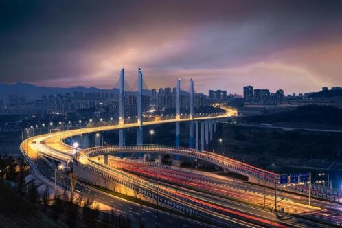 蔡家嘉陵江大橋項目位于渝武高速馬鞍石大橋、軌道六號線嘉陵江大橋之間,北起北碚區蔡家,南接兩江新區禮嘉。是城市南北向主干道的重要組成部分。主橋為雙塔雙索面斜拉橋,全長約1442米,主橋全長為 600米(跨徑布置為140米+320米+140米),斜拉橋下塔柱最高達110米,上塔柱高度最高達115米。立柱擎天、飛架南北,湖藍水紋韻律,優雅與氣勢并存,與自然有機融合,為重慶新晉的攝影打卡地。