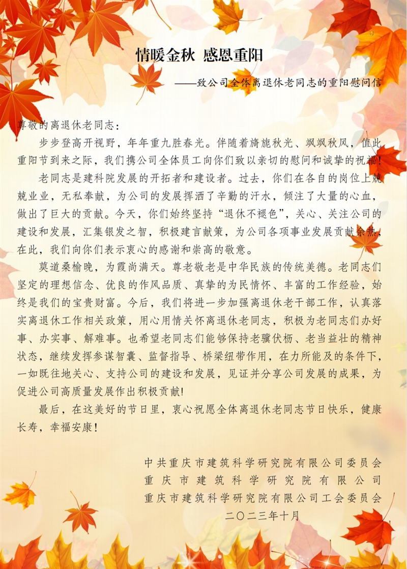 情暖金秋 感恩重陽(yáng)——致公司全體離退休老同志的重陽(yáng)慰問信